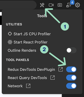The built-in tools for Network Inspector, Redux, Outline Renders (via react-scan) and React Query are integrated with the IDE and don't require any additional configuration.